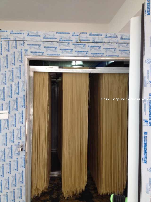 1冷風定條階段:剛進入烘房內的濕面條長度一般在1.4m左右,水分含量大,易因自重拉伸而造成斷條。所以,這個階段的任務是除去濕面條表層的一部分水分,以固定其組織,增加強度。此階段,濕面條中的水分均屬自由水,易靠蒸發作用去除,所以此階段采用加強空氣流動的辦法來促進水分蒸發。此階段控制室溫為 20-30℃,強通風,時間為總烘干時間的 15%,水分由 32%~35%下降為 27%~28%。